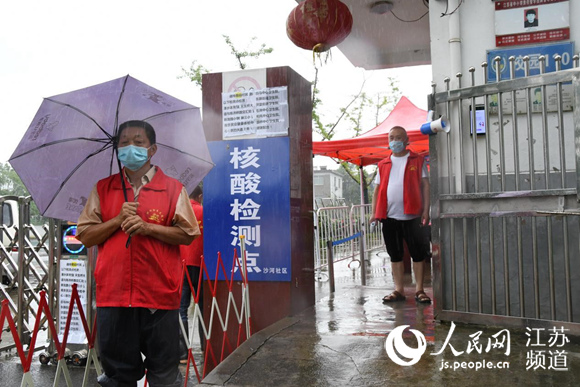 核酸檢測(cè)點(diǎn)工作者在風(fēng)雨中堅(jiān)守崗位。李四攝