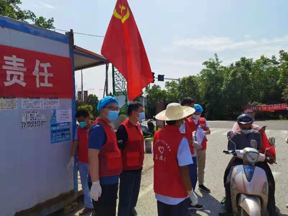 九塘行政村毛家圩村被調(diào)整為中風(fēng)險(xiǎn)地區(qū),九塘村毛家圩卡點(diǎn)承擔(dān)著禁止人員出入,防止疫情擴(kuò)散的重要任務(wù),是石湫街道抗擊疫情的主戰(zhàn)場之一!熬褪且阶钗kU(xiǎn)的地方去”,市水務(wù)局黨員志愿者沖在最前、頂在卡口,與交管、城管、村委聯(lián)動值守。在這場沒有硝煙的疫情阻擊戰(zhàn)中,面對執(zhí)勤卡點(diǎn)交通進(jìn)出流量大、人員身份復(fù)雜的艱巨挑戰(zhàn)及夜晚蚊蟲叮咬、白天高溫酷暑的艱苦環(huán)境,沒有一個(gè)同志退縮、沒有一個(gè)黨員怯戰(zhàn),合力筑起疫情防控的“銅墻鐵壁”。