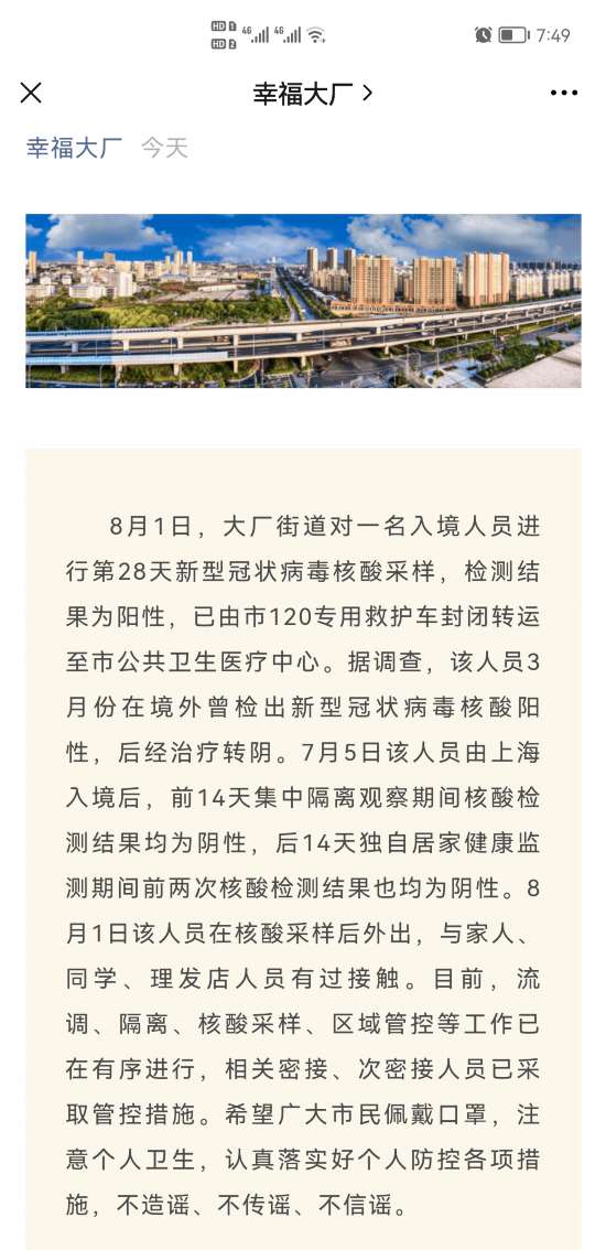 8月2日,南京市江北新區(qū)大廠街道發(fā)布情況通報(bào),對(duì)一名入境人員進(jìn)行第28天新型冠狀病毒核酸采樣,檢測(cè)結(jié)果為陽(yáng)性,已由南京市120專用救護(hù)車封閉轉(zhuǎn)運(yùn)至市公共衛(wèi)生醫(yī)療中心。
