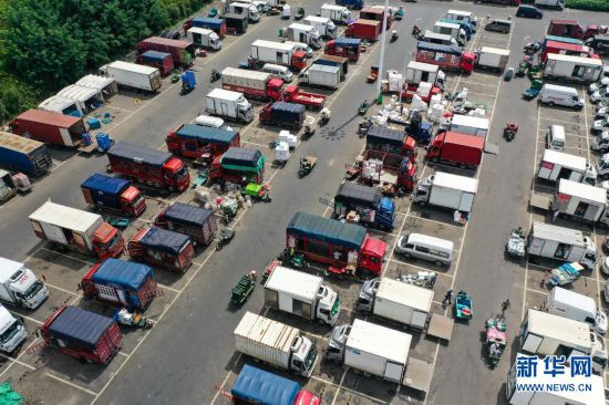 8月3日,在南京農(nóng)副產(chǎn)品物流配送中心,商戶在停車場裝運蔬菜等貨品(無人機照片)。
