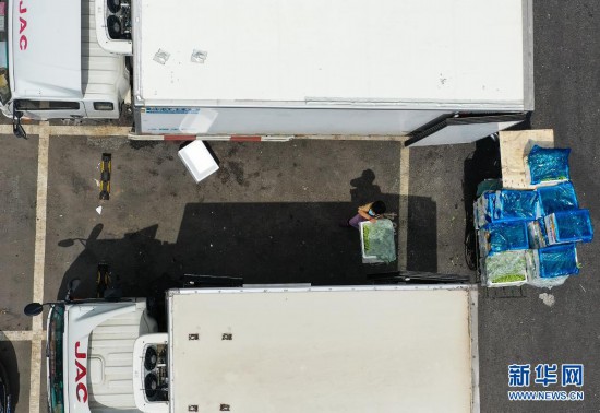 8月3日,在南京農(nóng)副產(chǎn)品物流配送中心,商戶在停車場裝運(yùn)蔬菜等貨品(無人機(jī)照片)。