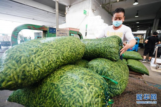8月3日,在南京農(nóng)副產(chǎn)品物流配送中心,商戶在裝運(yùn)蔬菜。