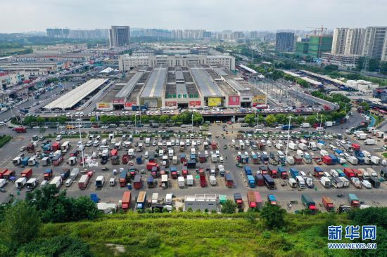 8月3日,在南京農(nóng)副產(chǎn)品物流配送中心,商戶在停車場裝運(yùn)蔬菜等貨品(無人機(jī)照片)。