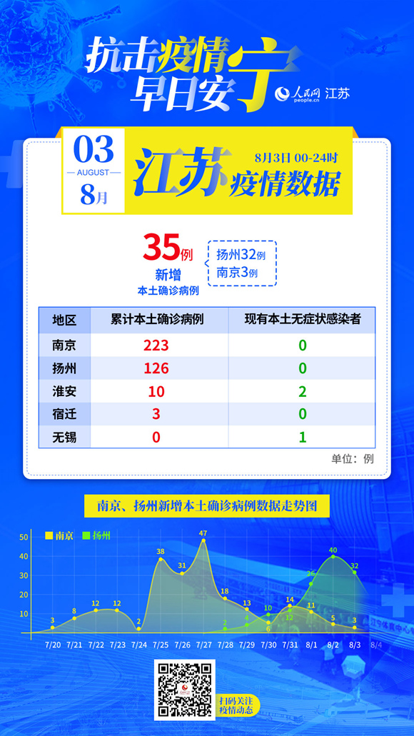 7月20日至今,南京市累計(jì)報(bào)告本土確診病例223例(輕型78例、普通型143例、重型2例);揚(yáng)州市累計(jì)報(bào)告本土確診病例126例(輕型43例、普通型79例、重型2例、危重型2例)。