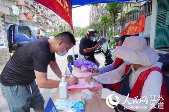“您好,請問您是小區(qū)的居民嗎?請來填寫一份告知書!8月1日下午,孝陵衛(wèi)街道孝陵衛(wèi)社區(qū)羅漢巷小區(qū)居民王文武在網(wǎng)格員的指導(dǎo)下,仔細填寫一張告知書。告知書上,附有一張表格,除基本信息外,還單獨列有核酸檢測與疫苗接種兩大類別,居民根據(jù)實際情況,勾選檢測或接種的次數(shù)。填寫完成后,社工對照信息,完善居民的“小區(qū)出入健康管理卡”。隨后,社區(qū)書記光麗將管理卡交到了王文武手中,“上面有社區(qū)蓋的章,出入小區(qū)又多了一層保障了!”