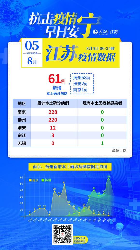 8月5日江蘇新增本土確診病例61例:揚(yáng)州58例南京1例淮安2例