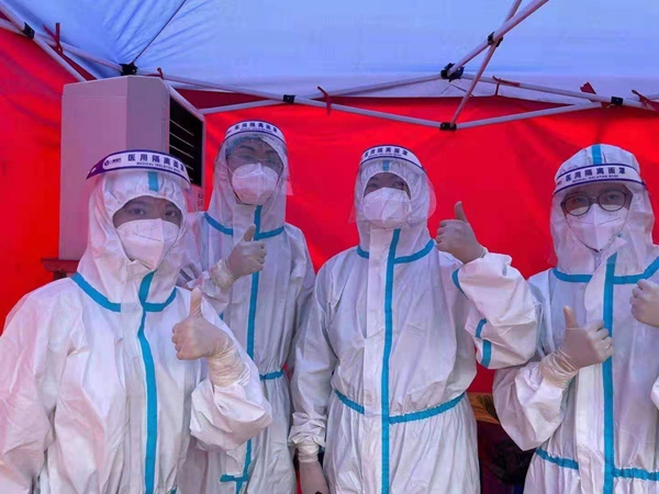 “我是年輕人,身體素質(zhì)好,我先上!”“對(duì),我們年輕人先上!”6名青年員工“搶”到了與醫(yī)護(hù)人員并肩奮戰(zhàn)的機(jī)會(huì)。從早上6時(shí)30分到中午12時(shí)30分,整整六個(gè)小時(shí),他們守在在檢測點(diǎn)的帳篷里,緊挨著醫(yī)護(hù)人員,為檢測者拍照讀取個(gè)人信息、核對(duì)手機(jī)號(hào)碼、手動(dòng)補(bǔ)充個(gè)人信息等。交接換崗時(shí),他們才發(fā)現(xiàn)防護(hù)服下的衣服早已濕透,口罩在臉上勒出一道道印痕,雙手已悶得發(fā)白……“看,這可是我和疫情戰(zhàn)斗的勛章!”青年員工小張用悶的發(fā)白的手指著臉說道。