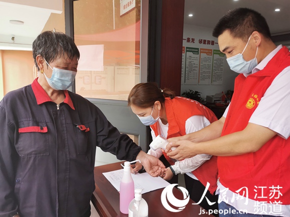 志愿者在執(zhí)勤點為群眾測量體溫。連云區(qū)委宣傳部供圖