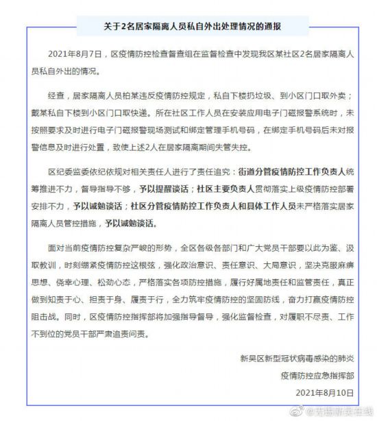 據(jù)中共無錫新吳區(qū)宣傳部官方微博“無錫新吳在線”,2021年8月7日,無錫市新吳區(qū)疫情防控檢查督查組在監(jiān)督檢查中發(fā)現(xiàn)該區(qū)某社區(qū)2名居家隔離人員私自外出的情況。