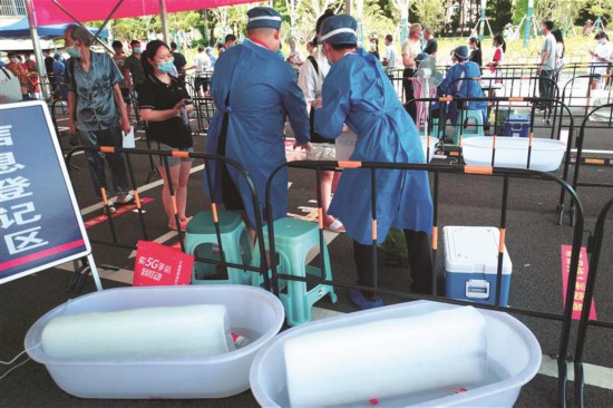 7日,梁溪區(qū)上馬墩街道耗時9個小時,完成3000多名社區(qū)居民的核酸檢測演練測試。街道在現(xiàn)場放置了冰塊和電扇為測試區(qū)域降溫。 (呂楓 攝)