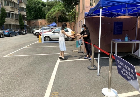 8月10日,和燕花苑12幢204的住戶隔“線”領(lǐng)取防疫物資。楊琴攝