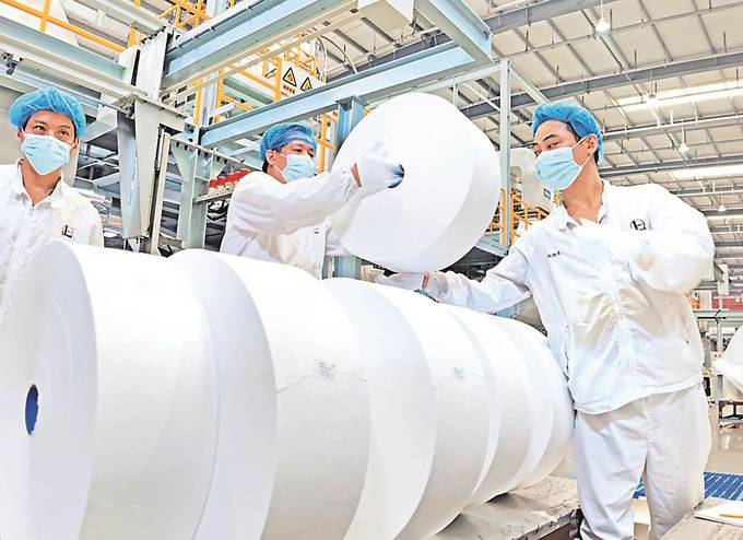 11日,儀征化纖公司短纖部員工在熔噴布生產(chǎn)線上忙碌,保障市場供應,助力疫情防控。 通訊員 劉玉福 本報記者 樂濤 攝