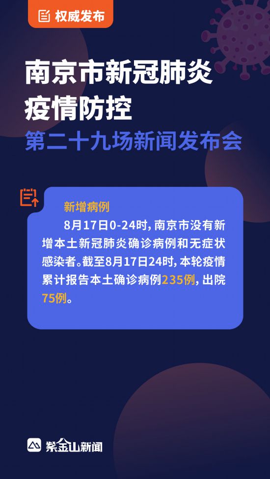 8月17日0-24時(shí),南京市沒(méi)有新增本土新冠肺炎確診病例和無(wú)癥狀感染者。截至8月17日24時(shí),本輪疫情累計(jì)報(bào)告本土確診病例235例,出院75例。