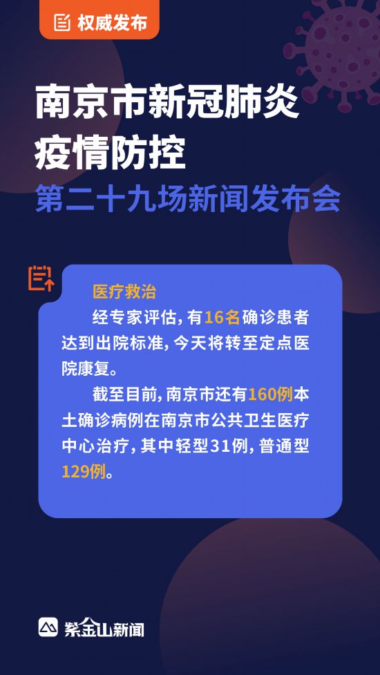 截至目前,南京市還有160例本土確診病例在南京市公共衛(wèi)生醫(yī)療中心治療,其中輕型31例,普通型129例。