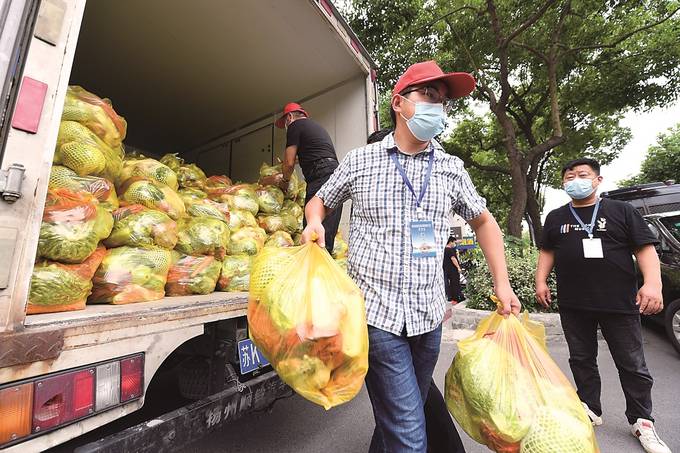 揚(yáng)州積極打通市內(nèi)物流渠道,實(shí)現(xiàn)批發(fā)市場(chǎng)、超市等商戶與居民直供對(duì)接,由社區(qū)或小區(qū)組織訂單購(gòu)買。圖為昨日,社區(qū)志愿者將居民訂購(gòu)的蔬菜送達(dá)錦旺苑小區(qū)。 本報(bào)記者 萬(wàn)程鵬 攝