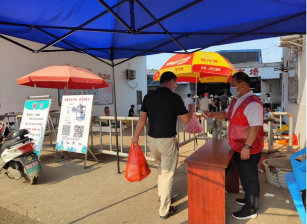 圖為志愿者在集貿(mào)市場(chǎng)測(cè)量體溫。 呂海清攝
