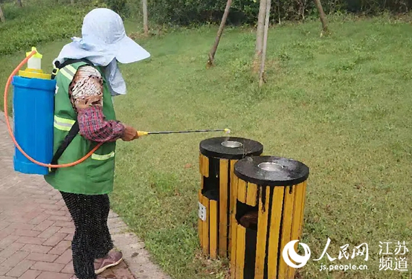 鎮(zhèn)江市綠化園林部門工作人正在對(duì)垃圾箱進(jìn)行消毒