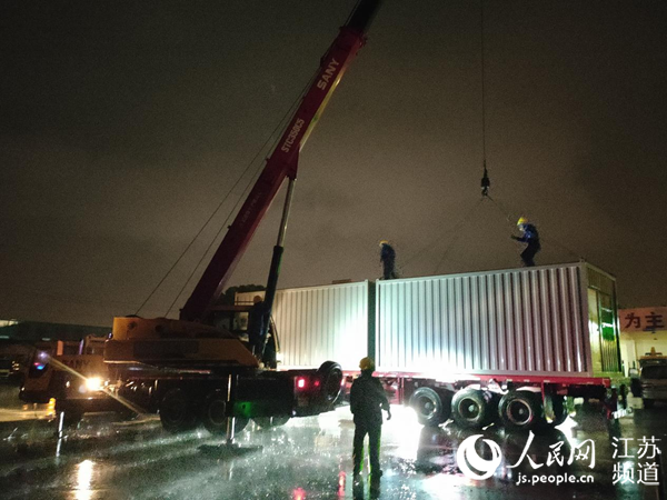 7月27日晚,無錫濱湖區(qū)住建局工作人冒雨為高速公路卡口緊急配備防雨棚和集裝箱板房。
