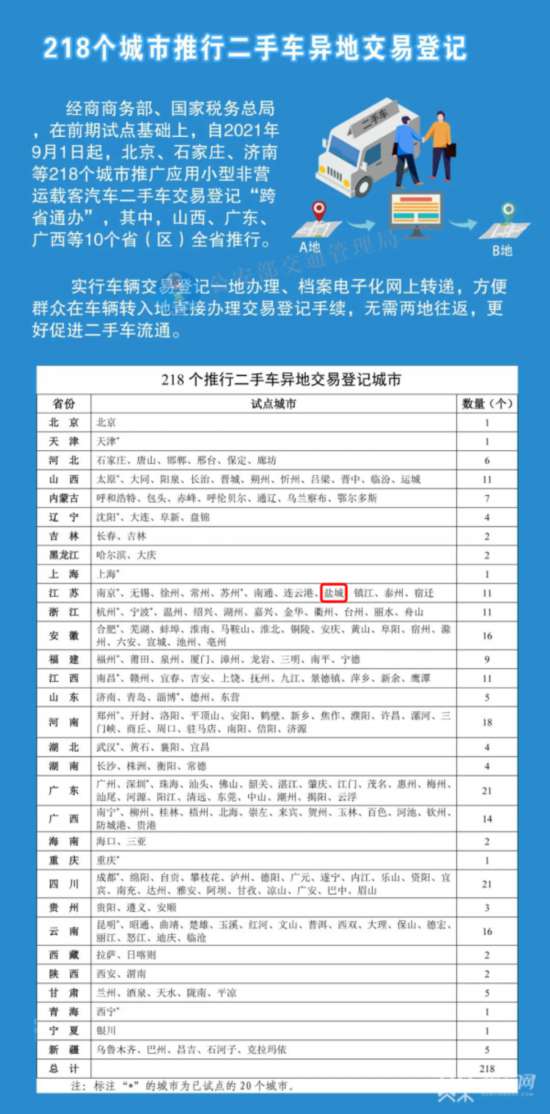 鹽城等218個城市推行二手車異地交易登記。在天津、太原、沈陽、上海等20個城市試點(diǎn)推行小型非營運(yùn)載客汽車二手車交易登記“跨省通辦”基礎(chǔ)上,北京、石家莊、濟(jì)南等218個城市推廣應(yīng)用,其中,山西、廣東、廣西等10個省(區(qū))全省推行。對二手車需要在異地交易的,實(shí)行二手車交易登記一地辦理、檔案電子化網(wǎng)上轉(zhuǎn)遞,實(shí)現(xiàn)二手車全國范圍內(nèi)跨省跨市異地交易登記,無需兩地往返,更好促進(jìn)二手車流通。