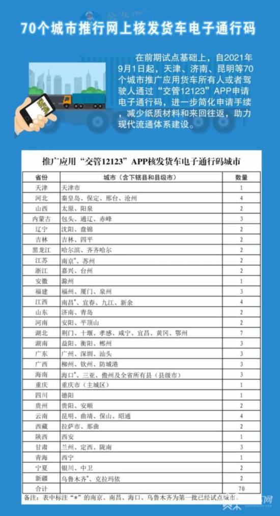 天津等70個城市推行網(wǎng)上核發(fā)貨車電子通行碼。在南京、南昌、海口、烏魯木齊4個城市試點(diǎn)貨車所有人或者駕駛?cè)送ㄟ^“交管12123”APP申請電子通行碼基礎(chǔ)上,天津、濟(jì)南、昆明等70個城市推廣應(yīng)用“交管12123”APP核發(fā)貨車電子通行碼,進(jìn)一步簡化申請手續(xù),減少紙質(zhì)材料和來回往返,助力現(xiàn)代流通體系建設(shè)。