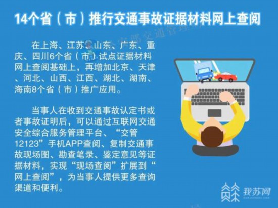 河北等14個省(市)推行交通事故證據(jù)材料網(wǎng)上查閱。在上海、江蘇、山東、廣東、重慶、四川6個。ㄊ校┰圏c(diǎn)證據(jù)材料網(wǎng)上查閱基礎(chǔ)上,再增加北京、天津、河北、山西、江西、湖北、湖南、海南8個。ㄊ校┩茝V應(yīng)用。當(dāng)事人在收到交通事故認(rèn)定書或者事故證明后,可以通過互聯(lián)網(wǎng)交通安全綜合服務(wù)管理平臺、“交管12123”APP查閱、復(fù)制交通事故現(xiàn)場圖、勘查筆錄、鑒定意見等證據(jù)材料,實(shí)現(xiàn)“現(xiàn)場查閱”擴(kuò)展到“網(wǎng)上查閱”,為當(dāng)事人提供更多查詢渠道和便利。
