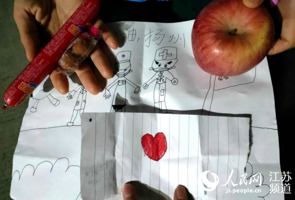 馬燕打開小姑娘送來的紙袋,看到里面除了有蘋果、香腸等食品外,還有一張從筆記本上撕下來的、折疊的不算太工整的小紙條,紙條上用稚嫩的筆跡寫著六個字:請你打開看看。馬燕打開紙條,一顆手繪的“紅心”展現(xiàn)在眼前,在另一張紙條上,是一幅小姑娘自己繪的畫,潔白的畫著一面國旗,紙的中間,是醫(yī)生、護士、群眾共同抗擊病毒的圖案。在畫的上方,“中國加油 揚州加油”八個稚嫩的字尤為引人注目。