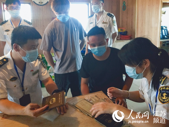 執(zhí)法人員走上船頭查驗(yàn)證照。鎮(zhèn)江海事局供圖