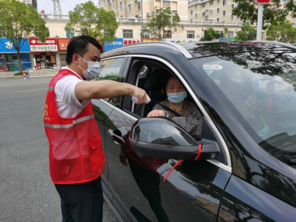 圖為黨支部書記在檢測(cè)點(diǎn)為過路司機(jī)測(cè)體溫。厲澄攝
