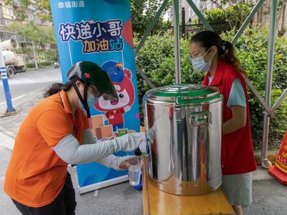 “師傅,這是我們自制的藿香茶,清涼解渴,還有充饑的小零食,您按喜好自取!痹O在幸福人家、幸福怡居等小區(qū)門口的“快遞小哥加油站”吸引了大家的注意。加油站雖然不起眼,但熱水補充、桌椅休息、急救藥品、手機充電等愛心服務一個都不少。不僅快遞小哥,經(jīng)過的環(huán)衛(wèi)工人也紛紛駐足,在這里歇歇腳、喝喝茶,補充能量。服務一群人,溫暖一座城,“快遞小哥加油站”的設立旨在讓勞動者們感受到真摯的關愛和城市治理的溫度。