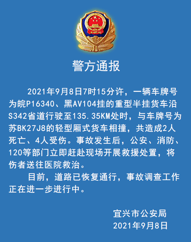 人民網(wǎng)南京9月8日電 (蕭瀟)據(jù)江蘇省宜興市公安局通報,9月8日7時15分許,一輛重型半掛貨車沿S342省道行駛時,與一輛輕型廂式貨車相撞,共造成2人死亡、4人受傷。事故發(fā)生后,公安、消防、120等部門立即趕赴現(xiàn)場開展救援處置,將傷者送往醫(yī)院救治。目前,道路已恢復通行,事故調查工作正在進一步進行中。