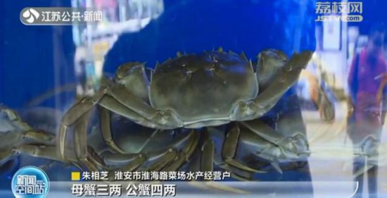 淮安市淮海路菜場水產(chǎn)經(jīng)營戶朱相芝說:“大的是公的半斤、母的四兩,價格120一斤;母蟹三兩、公蟹四兩一般價格70塊錢一斤,公蟹三兩、母蟹二兩五,這個價格50塊錢一斤,目前一天都在賣兩三百斤!