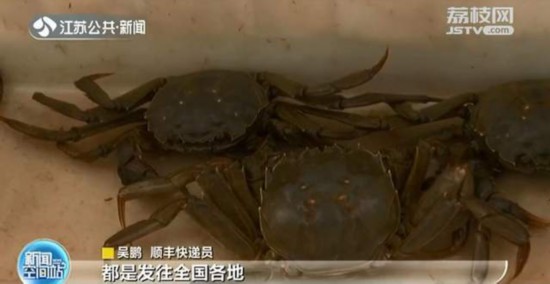 在泰州姜堰,地產(chǎn)的溱湖籪蟹則已經(jīng)上市。在這家溱湖籪蟹專賣店,記者看到不同大小的籪蟹被分類擺放在水池里,店主正忙著挑選籪蟹,快遞小哥早早候在旁邊,就等裝箱發(fā)貨。