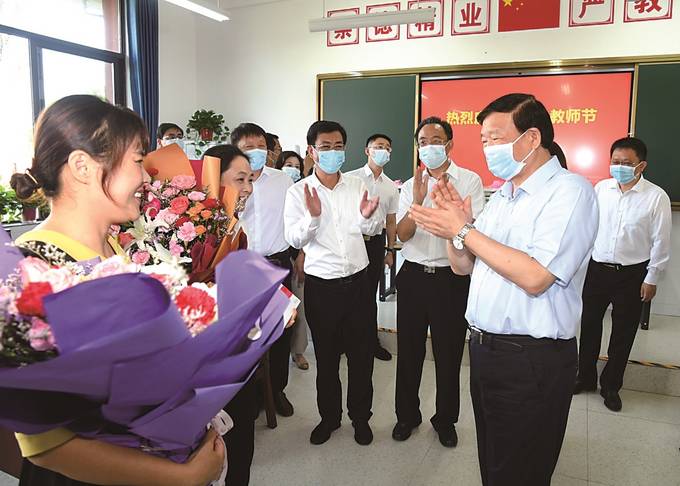 婁勤儉首先來到徐州沛縣龍城小學,詳細了解學校的招生、師資隊伍建設、落實“雙減”工作、校園疫情防控等情況,看到這里現(xiàn)代化的教學樓、實驗樓、學生食堂、風雨操場等設施配套齊全,學校還利用校內(nèi)校外資源打造了一批特色課程,婁勤儉說,農(nóng)村學校的布局和建設要把握“四化”同步規(guī)律,集中力量和資源,科學合理規(guī)劃,因地制宜推進,確保硬件條件、師資力量和辦學水平達到標準,為教育公平奠定基礎。婁勤儉來到教師辦公室看望慰問教師代表,與老師們親切交談,向大家致以節(jié)日的問候。他說,小學是孩子們打基礎的重要階段,希望老師更好遵循教育規(guī)律和少年兒童成長規(guī)律,注重培養(yǎng)學生的好奇心和良好學習習慣,促進他們德智體美勞全面發(fā)展。在沛縣高級中學,了解到學校剛剛遷入新校區(qū),全部按照省高品質(zhì)示范高中標準配備,今年高考該校實現(xiàn)歷史性突破,許多優(yōu)秀學子被知名高校錄取。婁勤儉非常高興,對學校的建設和工作給予充分肯定,對老師們堅守三尺講臺、無私奉獻付出表示感謝。他說,高中階段正值青少年形成正確的世界觀、人生觀、價值觀的關鍵時期,老師在傳授學科知識的同時一定要當好學生成長的引路人,重視思想政治教育,引導學生樹立遠大理想、家國情懷和文化自信,成為中國特色社會主義事業(yè)的合格建設者和接班人。