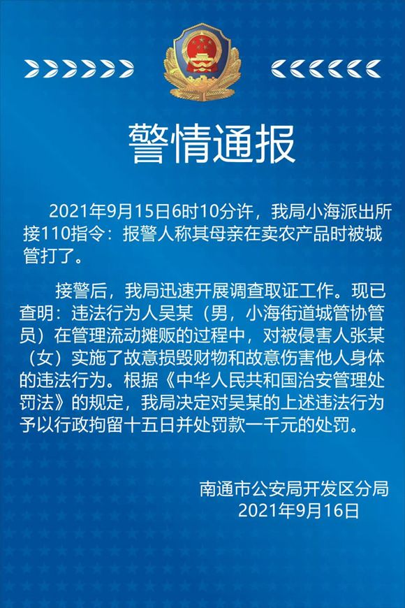 據(jù)警方通報(bào),9月15日6時(shí)10分許,小海派出所接110指令:報(bào)警人稱其母親在賣農(nóng)產(chǎn)品時(shí)被城管打了。接警后,該局迅速開展調(diào)查取證工作,F(xiàn)已查明,違法行為人吳某(男,小海街道城管協(xié)管員)在管理流動(dòng)攤販的過程中,對被侵害人張某(女)實(shí)施了故意損毀財(cái)物和故意傷害他人身體的違法行為。根據(jù)《治安管理處罰法》的規(guī)定,南通市公安局開發(fā)區(qū)分局決定對吳某的上述違法行為予以行政拘留15日,并處罰款1000元的處罰。