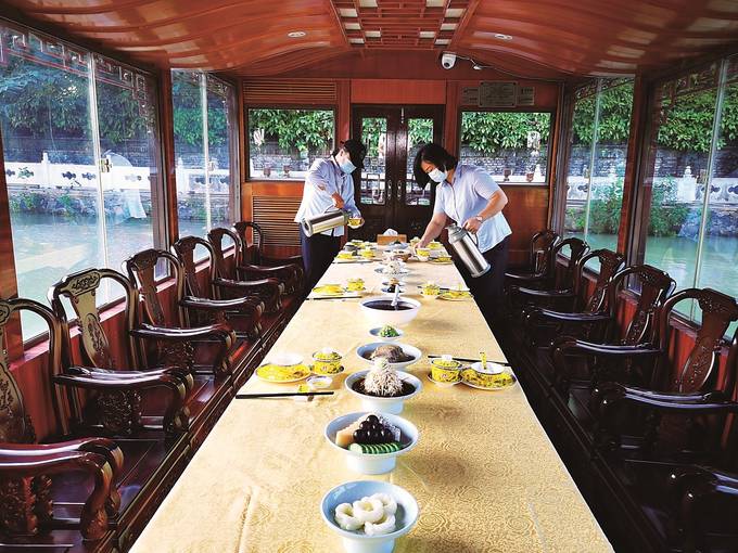 本報訊 (記者 李源 李鑫津) 瘦西湖船宴享有盛名。9月19日8點,在揚州御碼頭一艘游船上,工作人員正在準(zhǔn)備“船宴”。