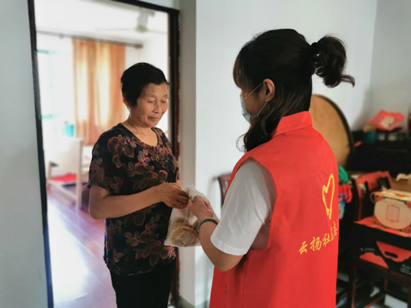 社區(qū)志愿者為老人送麥餅。錫山區(qū)委宣傳部供圖