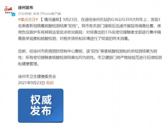 原標(biāo)題:徐州通報(bào):G362/G359次列車(chē)上的1名乘客核酸檢測(cè)結(jié)果“陽(yáng)性”,復(fù)核為陰性