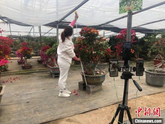花農(nóng)在直播中現(xiàn)場為消費者測量盆景高度。 劉林 攝
