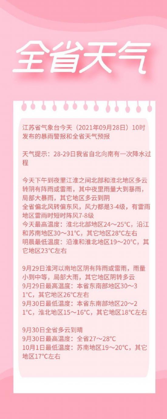 今天下午到夜里江淮之間北部和淮北地區(qū)多云轉(zhuǎn)陰有陣雨或雷雨,其中夜里雨量大到暴雨,局部大暴雨,其它地區(qū)多云到陰,全省偏北風轉(zhuǎn)偏東風,風力都是3-4級,有雷雨地區(qū)雷雨時短時陣風7-8級,今天最高溫度:淮北北部地區(qū)24~25℃,沿江和蘇南地區(qū)30~31℃,其它地區(qū)28℃左右,明晨最低溫度:沿淮和淮北地區(qū)19~20℃,其它地區(qū)23℃左右。