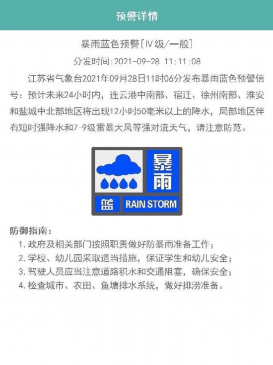 我蘇網(wǎng)訊 暴雨警報!江蘇省氣象臺2021年09月28日11時06分發(fā)布暴雨藍色預警信號:預計未來24小時內(nèi),連云港中南部、宿遷、徐州南部、淮安和鹽城中北部地區(qū)將出現(xiàn)12小時50毫米以上的降水,局部地區(qū)伴有短時強降水和7-9級雷暴大風等強對流天氣,請注意防范。