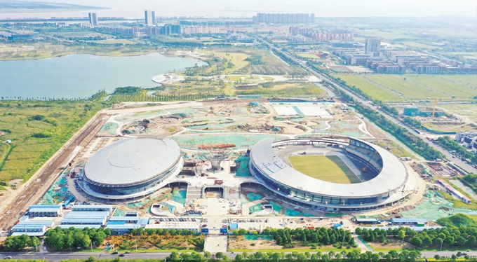 圖為建設中的體育中心體育場。區(qū)體育中心項目包括體育場、體育館、接待展示中心及體育公園,目前工程主體已完工,進入精裝修階段。據(jù)介紹,金屬屋面已完成閉水,開始安裝鋁板;體育場草皮已開始種植,塑膠跑道正在施工,預計年底完成全部施工。