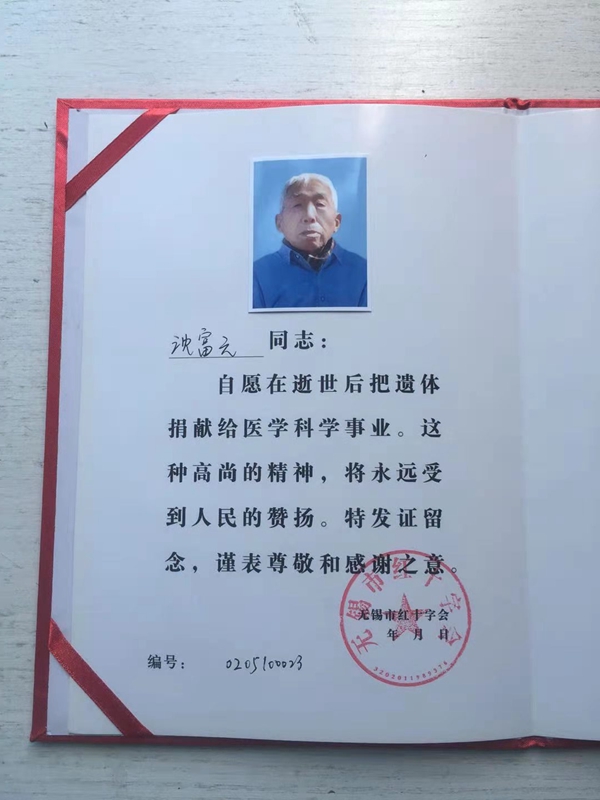 一家人商量定了,老人就不斷催促兒子去辦捐贈(zèng)手續(xù)。錫山區(qū)紅十字會(huì)許麗麗說,接到老人的捐贈(zèng)請(qǐng)求后,他們立即聯(lián)系了江南大學(xué)醫(yī)學(xué)院接收站的吳教授,并在9月28日辦好手續(xù),把捐贈(zèng)證書送到了老人的病房。