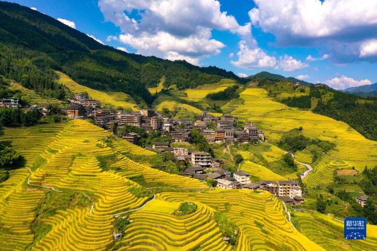 這是10月1日拍攝的廣西桂林市龍勝各族自治縣龍脊梯田秋日景觀(無人機照片)。