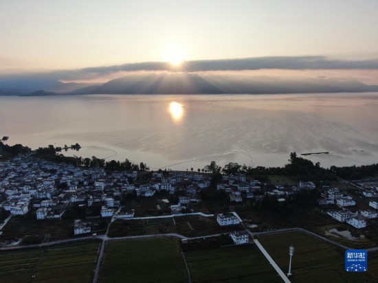 這是10月2日在云南大理灣橋鎮(zhèn)拍攝的洱海日出景觀(無人機照片)。