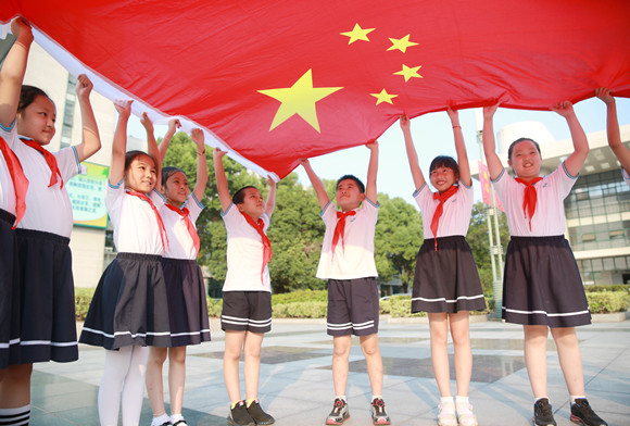 圖為靖江外國語學(xué)校學(xué)生與國旗合影。佘靖華攝