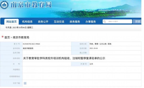 我蘇網訊10月4日,南京市教育局最新發(fā)布《關于教育審批學科類校外培訓機構驗收、注銷和暫停復課名單的公示》。全文如下: