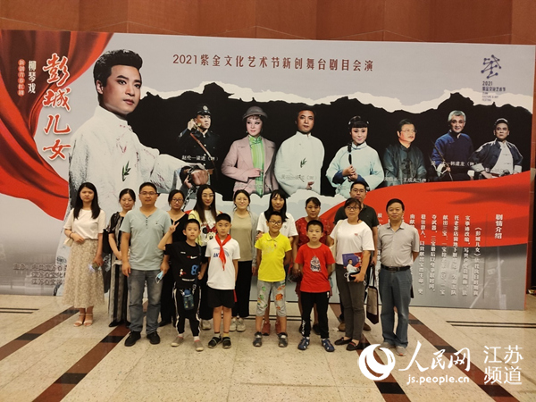 社區(qū)宣傳員、機關(guān)黨務員在柳琴戲《彭城兒女》海報前合影。錢橋街道供圖