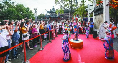 昨日,在夫子廟等地,《國(guó)潮樂(lè)起 戲韻秦淮》系列沉浸式演出,讓游客感受到傳統(tǒng)非遺的魅力。 通訊員 秦萱 南報(bào)融媒體記者 董家訓(xùn)攝