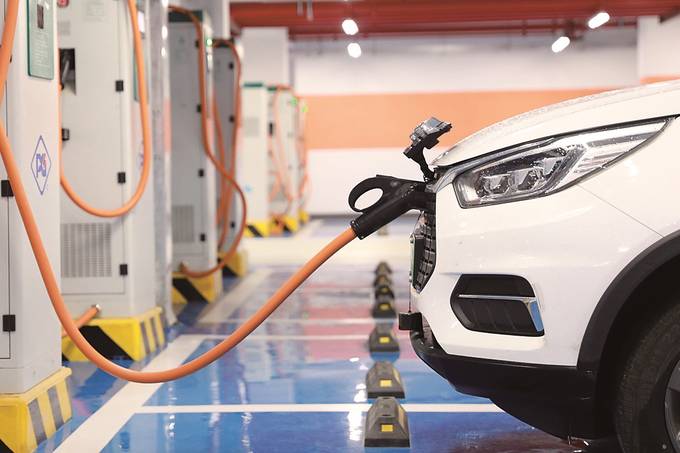 新能源汽車正在南京市江寧區(qū)電動汽車智能充電綜合服務樓宇充電。 本報記者 蔣文超 攝