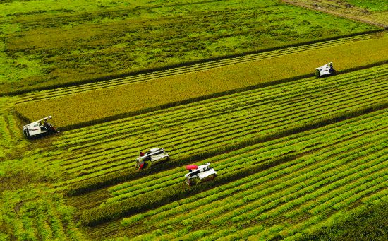 金秋時(shí)節(jié)、稻谷飄香。揚(yáng)州高郵經(jīng)濟(jì)開(kāi)發(fā)區(qū)腰圩村水稻陸續(xù)成熟,田野稻浪滾滾、一片金黃。昨日,當(dāng)?shù)剞r(nóng)民搶抓農(nóng)時(shí)、收割水稻,田間地頭一派豐收景象。 張旭 孟德龍 攝